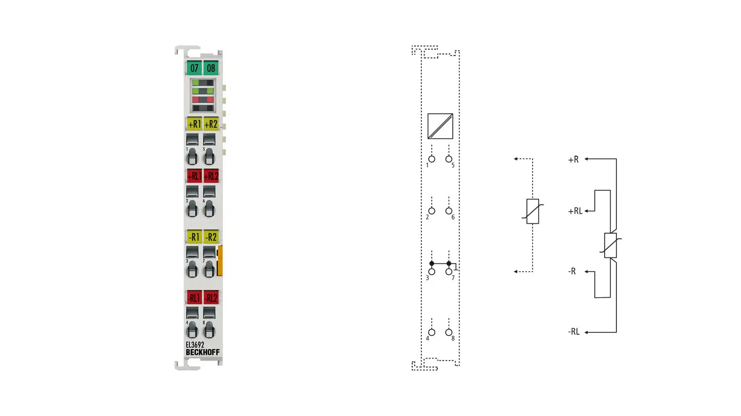 Die analoge Eingangsklemme EL3692 erlaubt die direkte Widerstandsmessung in neun Messbereichen von 0…100 mΩ bis 0…10 MΩ. Die Schaltung der EtherCAT-Klemme kann die Messung in 2- und 4-Leitertechnik betreiben. Die EL3692 verfügt über eine Messbereichsumschaltung, die automatisch oder durch die Steuerung erfolgen kann. Durch die galvanische Trennung, kann im einkanaligen Betrieb auch ein spannungsführendes Objekt gemessen werden. Die EtherCAT-Klemme zeigt ihren Zustand durch Leuchtdioden an. Störungen (z. B. Drahtbruch) signalisieren Error-LEDs.