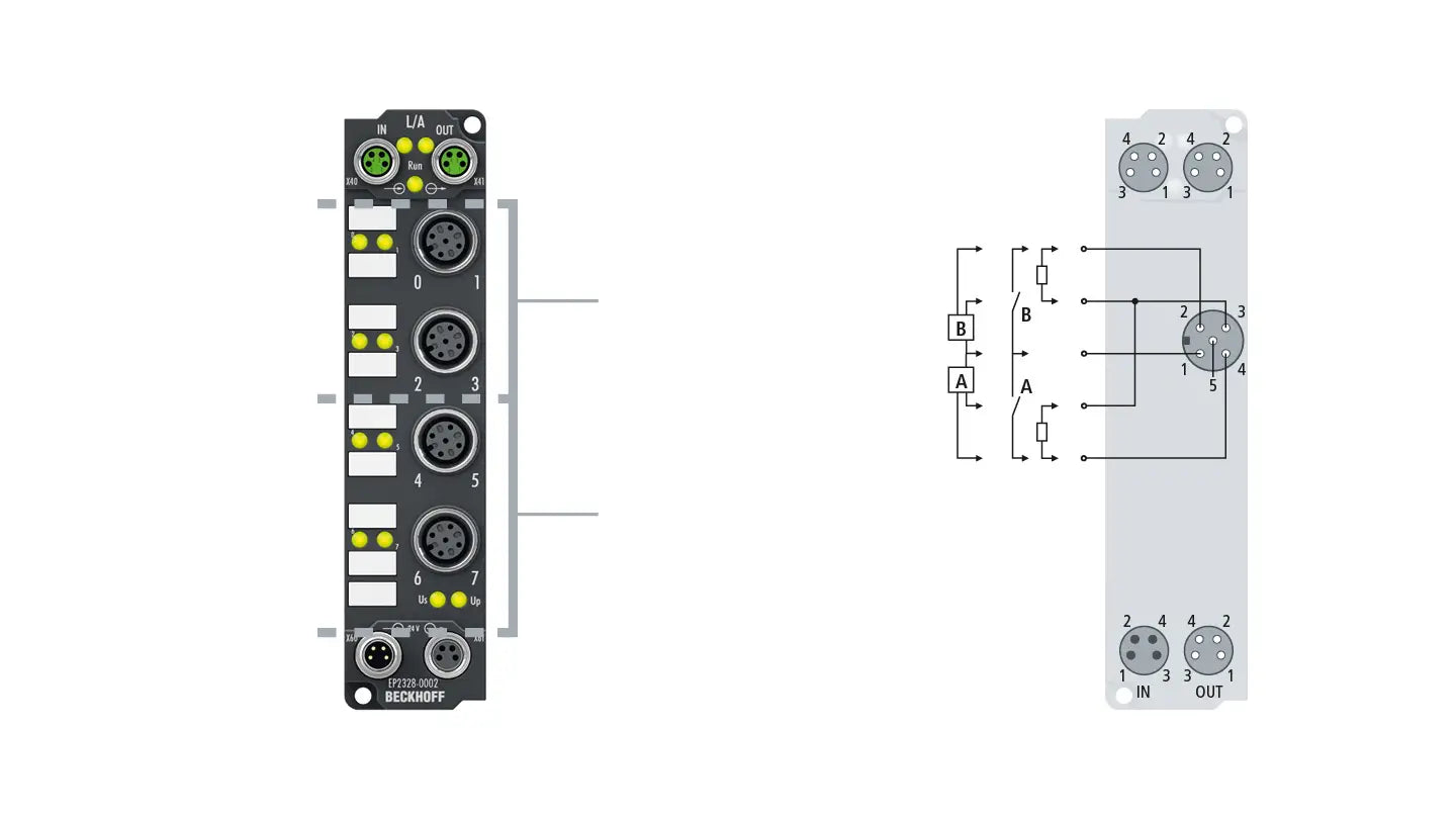 Die EtherCAT Box EP2328-0002 kombiniert vier digitale Eingänge (zwei M12-Buchsen oben) und vier digitale Ausgänge (zwei M12-Buchsen unten) auf einem Gerät. Die Eingänge haben einen Filter von 3,0 ms. Die Ausgänge verarbeiten Lastströme bis 2,0 A, sind kurzschlussfest und verpolungsgeschützt. Der Signalzustand wird über Leuchtdioden angezeigt, der Signalanschluss erfolgt über schraubbare M12-Steckverbinder. Je M12-Buchse sind zwei Kanäle verfügbar. Der Summenstrom aller Ausgänge ist auf 4 A begrenzt.