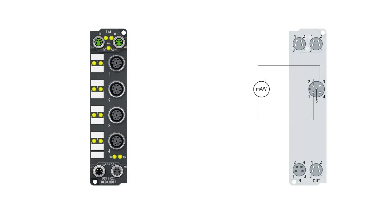 EP3184-0002 | EtherCAT Box, 4-Kanal-Analog-Eingang, Multifunktion, ±10 V, 0/4…20 mA, 16 Bit, single-ended, M12